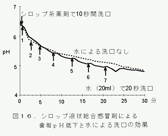 このようなシロップを添加された薬は、図16のように歯垢のpHを低下させます。その後に歯垢のpHを上げようと水でうがいをさせても、歯垢のpHはなかなか回復しません。