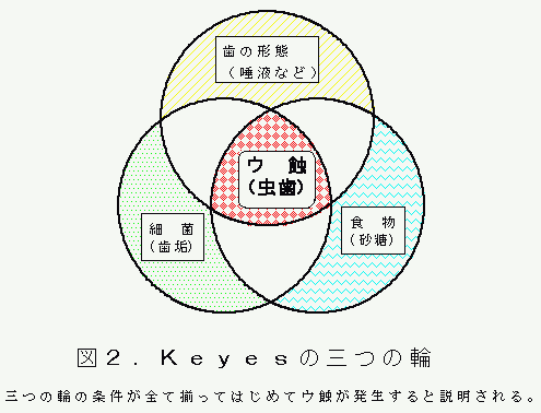 2.Keyesの三つの輪 (図2)食べ物、バクテリア(細菌)、宿主(歯など生体側の要因)、これら三つの要因が揃って、始めてむし歯の発生に至るというKeyes(カイス)の三つの輪による説明は良く知られています。