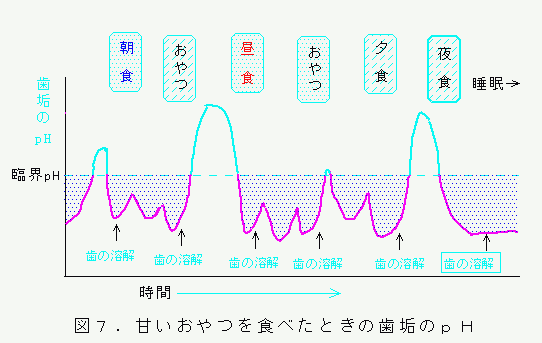 6.おやつを食べるとむし歯になり易い (図7)ところが、食事の間に間食をすると、歯が修復される間もなく歯垢の中で再び酸がつくられ、歯垢のpHが低下して歯が溶け続けます。ついには、歯の修復が追いつかなくなって、初期のむし歯が発生することになります。