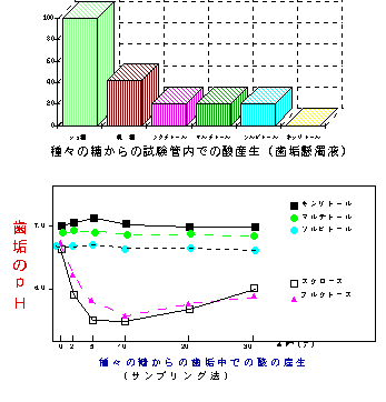 キシリトールの宣伝によく使われる図があります(左図の上)。 この図では、ソルビト−ル、マルチトールなどからは砂糖の20%ほどの酸がつくられるが、キシリトールからの酸の産生は0%であり、格段に優れた糖であるように見えます。このデータは、歯垢を集めて試験管内(酸素のある状態)で酸の産生を調べたものです。 しかし、糖アルコールからの酸の産生は酸素の有無で大き影響を受けるので、酸素のある状態で行ったこのような研究結果は、「酸素のない実際の歯垢中」の糖アルコールからの酸の産生とは全く違ったものになります。同じ論文の中で、実際の歯垢中での酸産生によるpH低下データ(左図の下)が示されており、ここではキシリトール、マルチトール、ソルビト−ルの間に酸の産生の違いはありません。 また、1985年に米国サンアントニオで世界各国の研究者を集めて4日間にわたって行なわれた「食品のウ蝕誘発性を評価についてのコンセンサス会議」でも、ソルビト−ルをむし歯を起こす力ゼロの基準の糖と定めています。 すなわち、ソルビト−ルにむし歯を起こす力があるように言うのはおかしいのです。 |