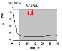 | あるトローチをそのままなめると、唾液の分泌を促進するのでむし歯を起こすほどには歯垢のpHを低下させなかったのですが、同じものを水に溶かして食べると歯垢のpHがむし歯の危険ゾーン(5.5以下)まで低下した例もあります(下図)。 | |||